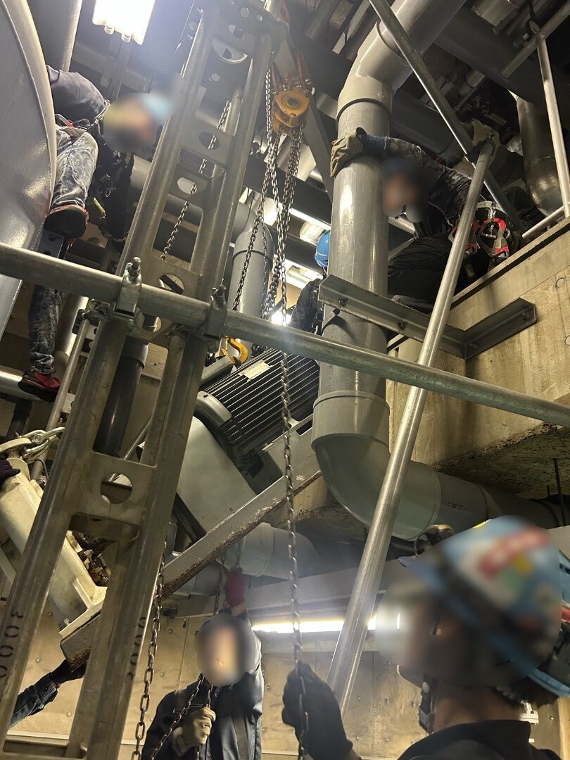作業スペースに合わせて専用の櫓を設置し、ジャッキアップと台車移動、チェーンブロックによる吊り上げを組み合わせることで、安全かつ効率的にポンプ7台の交換作業 を行うことができました。